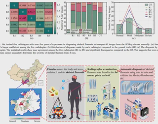 Skeletal fluorosis is a chronic metabolic bone disease caused by long-term overconsumption of fluoride, posing a significant health risk to humans globally. However, even professional radiologists cannot accurately determine the severity of lesions in skeletal fluorosis X-rays. Currently, there is limited research on using deep learning to diagnose skeletal fluorosis and no public datasets. Therefore, we construct the world’s first open-source skeletal fluorosis X-ray dataset (SFXRay). To advance the automated grading diagnosis of skeletal fluorosis, we propose a novel convolutional state space model with multi-window cross-scan (Mwinc-Mamba). Mwinc-Mamba adopts a dual-branch structure, integrating the convolutional neural network (CNN) with the state space model (SSM). The CNN branch focuses on extracting local features, whereas the SSM branch models long-range dependencies. This effective combination compensates for the SSM’s shortcoming, excelling at modeling long-range dependencies but not extracting local features. Additionally, we introduce a multi-window cross-scan mechanism in SSM. It divides the patches into multiple windows and performs cross-scan to capture multi-grained lesion features, thereby accurately identifying the severity of lesions. On the SFXRay dataset, the Mwinc-Mamba model achieves diagnostic accuracies of 83.33% and 66.67% for binary and multi-classification respectively, significantly outperforming other deep learning models. Notably, in multi-classification, the accuracy of the Mwinc-Mamba model differs by only 3.33% from the average accuracy of the radiologists, highlighting its strong potential for clinical application.